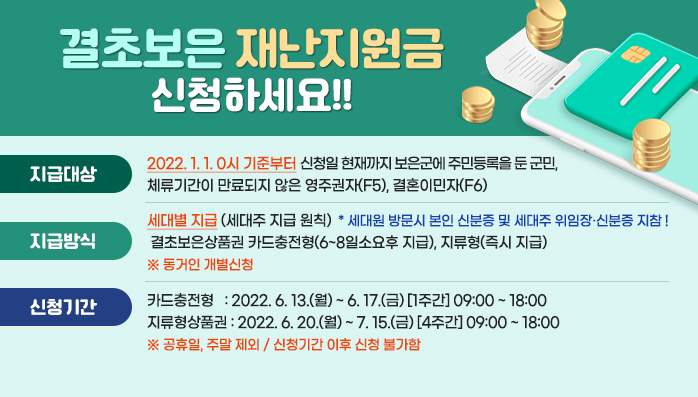 - 충북 보은군 : 1인당 15만원 결초보은 상품권 지급, 6.13 ~ 7.15, 거주지 행정복지센터 방문 신청
