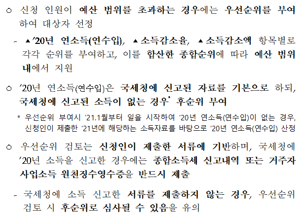 - 지원 요건 : 하기 추가 설명 참조 (자격 요건, 소득감소 요건을 충족하고 우선순위 기준에 맞춰 지원)