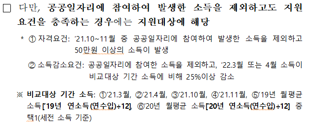 - 소득 요건 : 2022년 3월 또는 4월 소득이 비교대상 기간 소득 대비 25% 이상 감소