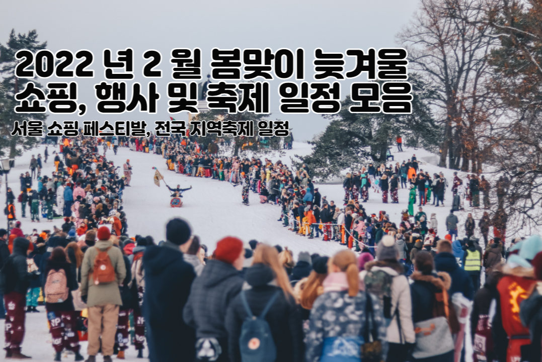 2022년 봄맞이 그리고 늦겨울 2월 전국 쇼핑, 행사 및 축제 일정을 모아보았습니다. 오미크론으로 인해 거리두기를 비롯해 나들이가 많이 위축된 감은 있지만 그래도 아직 많은 행사들이 진행이 되고 있습니다. 2 월의 행사 어떤 것들이 있는지 알아봅니다.